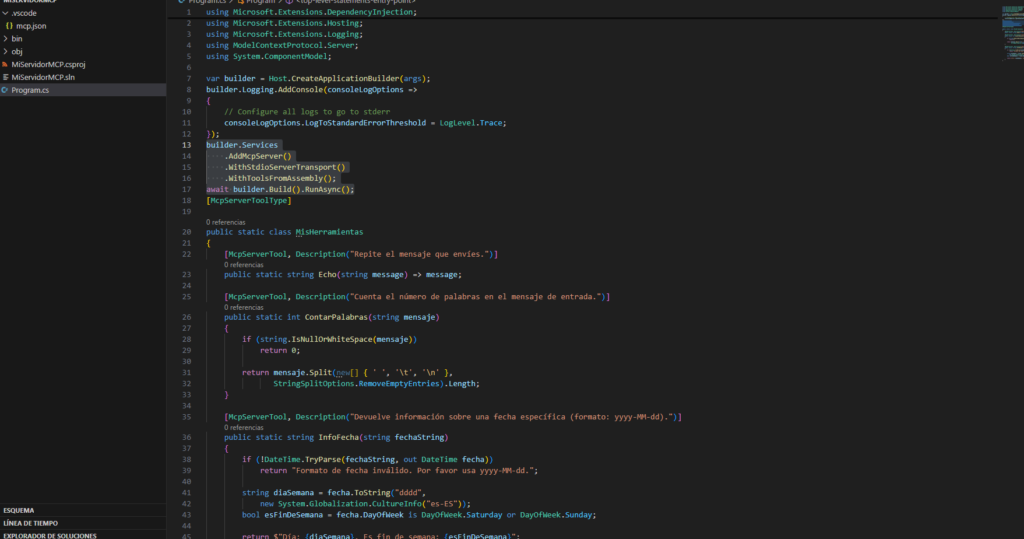 El atributo [Description]: Esta descripción es importante. Ayuda al host MCP (Copilot en VS Code) a entender qué hace cada herramienta. Esta descripción guía a la IA para elegir el método más relevante basándose en lo que le pedís en lenguaje natural.