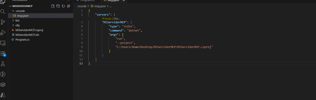 type: "stdio": Especifica que usamos entrada/salida estándar para la comunicación, que es el método requerido para servidores MCP basados en consola de C#.command: "dotnet": El comando para ejecutar tu aplicación.args: Los argumentos que le pasamos al comando, incluyendo la ruta a tu proyecto.