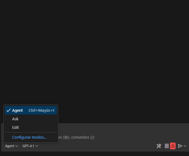 En la parte superior del panel de chat, cambiá el modo de “Chat” a “Agent”.